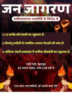 इस जनजागरण सभा का मुख्य उद्देश्य जनता को माफिया और भ्रष्ट राजनीति के गठजोड़ से अवगत कराना तथा इसके खिलाफ संगठित होकर आवाज़ बुलंद करना है। सभा में विशेष रूप से भाजपा की खनन नीति से जुड़े 30 करोड़ की एफडी का खुलासा, भाजपा युवा मोर्चा नेता हिमांशु चमोली से जुड़े नेताओं की जांच की मांग, तथा अंकिता भंडारी हत्याकांड में शामिल वीआईपी का खुलासा प्रमुख मुद्दे रहेंगे। समिति ने प्रदेश की जनता से अधिक से अधिक संख्या में इस सभा में पहुंचकर भ्रष्टाचार और माफिया संस्कृति के खिलाफ अपना समर्थन दर्ज कराने की अपील की है।